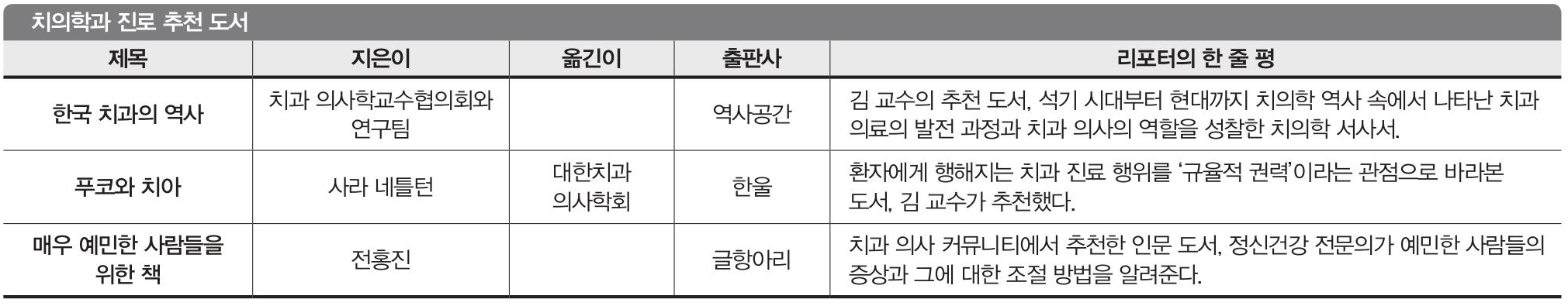 김 교수는 “진료하는 사람의 관점에서 치과 의사의 역할, 환자와의 상호작용, 치과 진단과 치료, 구강 위생의 중요성 등을 가벼운 필체로, 하지만 핵심적으로 전달한다. 치과는 인간의 일상과 관계가 밀접하고, 재료를 다듬어 ‘해 넣어야’ 하는 분야라 사회·경제적인 부분과도 관련성이 크다. 의료 계열 직업을 꿈꾸는 사람이라면 이 책을 읽고 치과를 중심으로 벌어지는 사회·경제적 갈등을 고민해보는 것도 직업관을 형성하는 데 도움이 될 것“이라고 추천의 이유를 밝혔다.