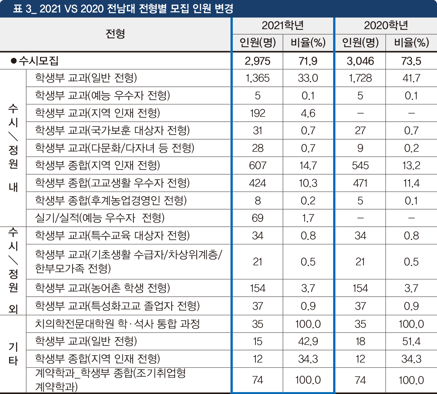 2021 전남대 수시 모집에서 전년 대비 주요 변화는 첨단 학과 신설과 학생부 교과 전형 수능 최저 학력 기준 완화, 학생부 반영 교과군 변경, 복수 지원 가능 횟수 증가 등이다.