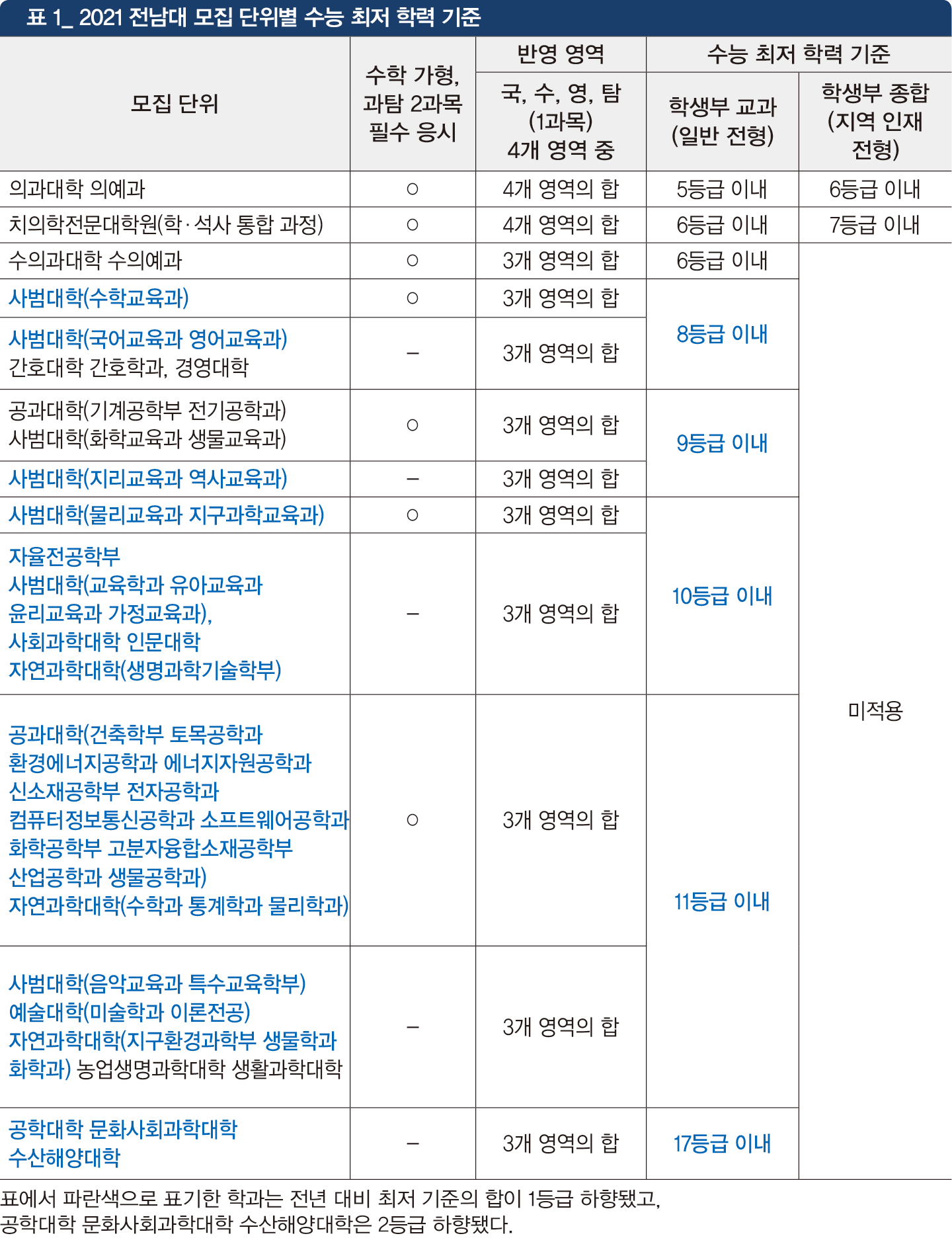 수학교육과 영어교육과 국어교육과 등이 2개 영역 하향 조정되어 경영학과, 간호학과와 함께 8등급으로 조정됐다. 인문대학과 사회대학은 10등급 이내, 공과대학 일부와 자연대학 농생명과학대학 생활과학대학은 11등급 이내다. 또 공과대학과 사범대학 일부 학과, 자연대학 일부 학과는 수학 가형 및 과학탐구를 필수로 응시해야 한다.