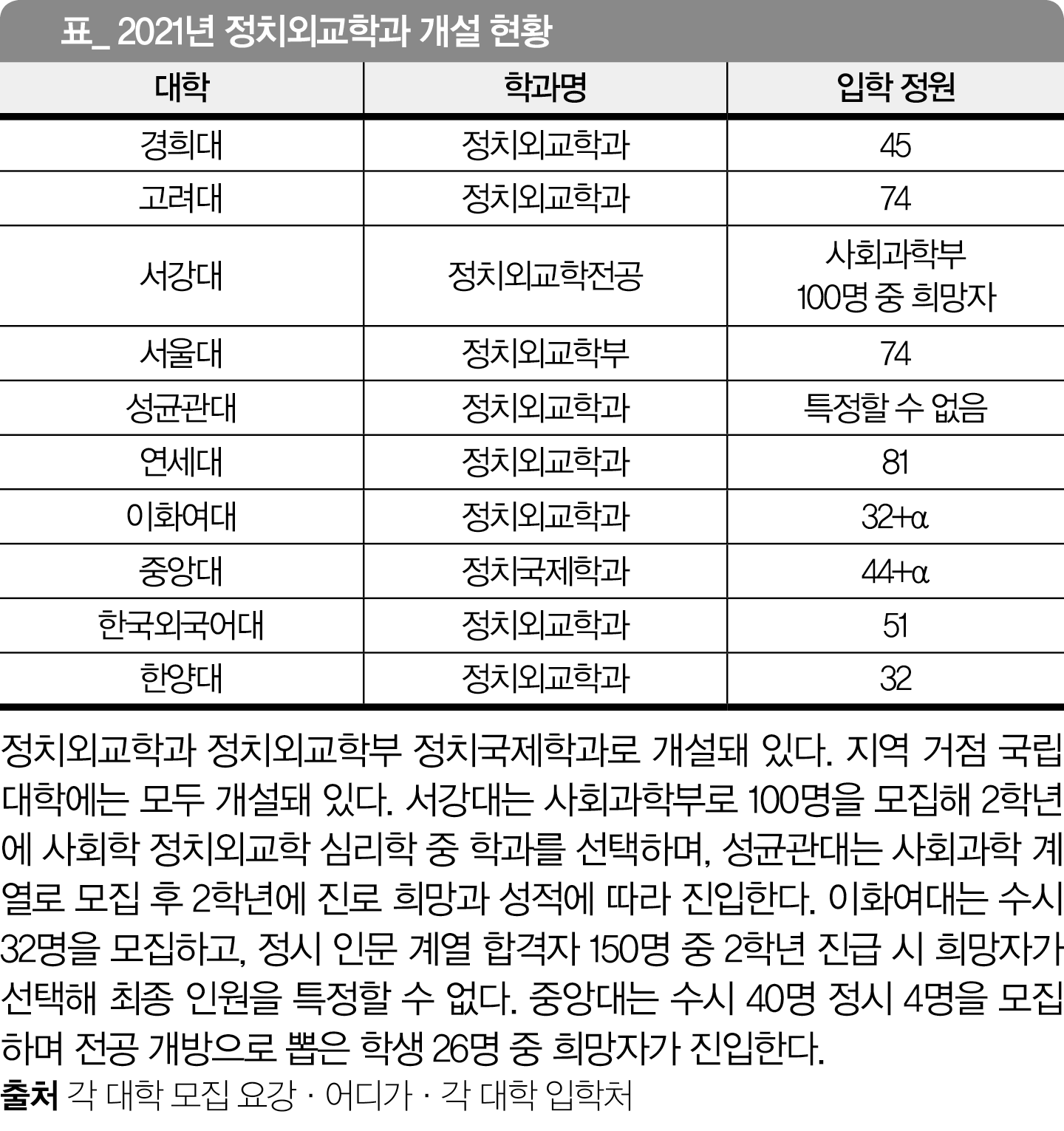 정치학은 권력이 어떻게 작동하는지에 관심을 갖고, 외교는 세계 각국 간 정치를 연구한다. 국외 대다수 대학에서는 정치외교학과 대신 정치학과로 개설돼 있다. 외교를 정치학의 세부 분야인 ‘국제정치’로 배우는 것이다.
