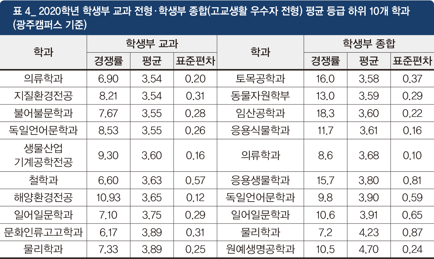 2020학년 대입에서 교과 성적 기준 하위 10개 학과 중 대부분은 배치표 상에서 중하위권에 위치한 학과들로, 학생부 교과 전형 중 물리학과는 수능 최저 학력 기준에서 수학 가형을 지정했다는 점이 특징적이다. 전년 대비 경쟁률과 선발 인원이 대입 결과에 영향을 줄 수 있기 때문에 대학 입학처 홈페이지에서 공개하는 3개년 경쟁률 및 선발인원 변화를 미리 확인하고 수시 지원 시 최종 경쟁률을 참고해 지원하는 전략이 필요하다.