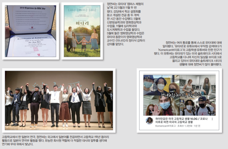 세계 교육을 탐구하는 ‘국제교육포럼반’ 동아리에서 미국 교육과 입시 제도에 대해 탐구함. 모교 방문의 날에 출신 중학교를 방문함.