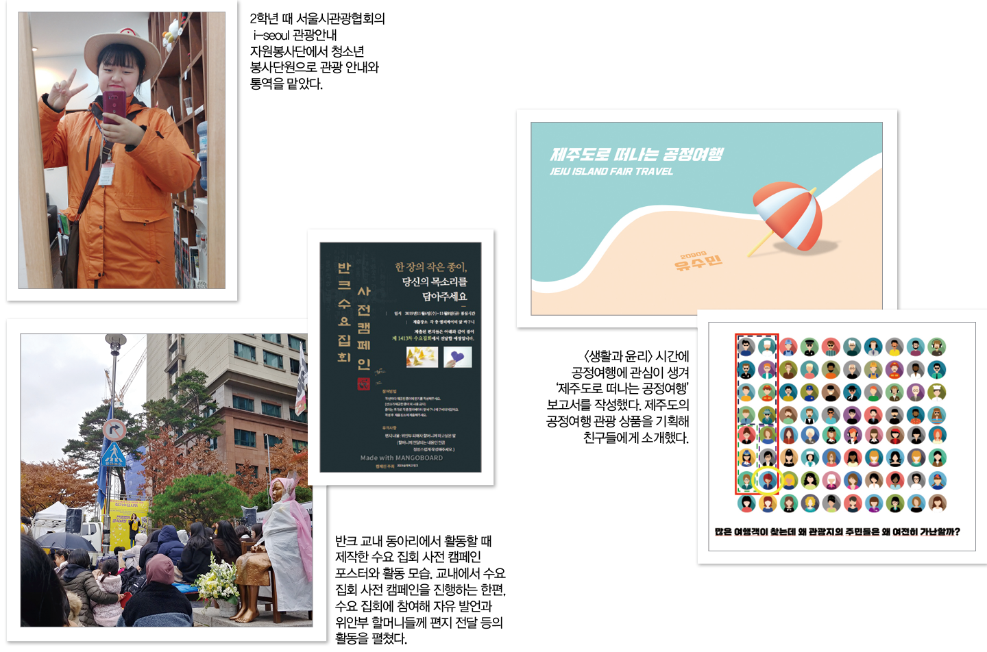 ▒ 창의적 체험 활동 서울시 관광안내자원봉사단 활동을 꾸준히 하면서 외국인 관광객이 쉽게 길을 찾을 수 있게 영어와 중국어 소통 능력을 적극적으로 활용하고 아픈 외국인 관광객을 병원으로 안내하는 등 적극적 역할을 함. 공정여행에 관심이 많아, 직접 1박 2일 제주도 공정여행 일정표를 짜서 친구들에게 선보이고 큰 호응을 얻음.