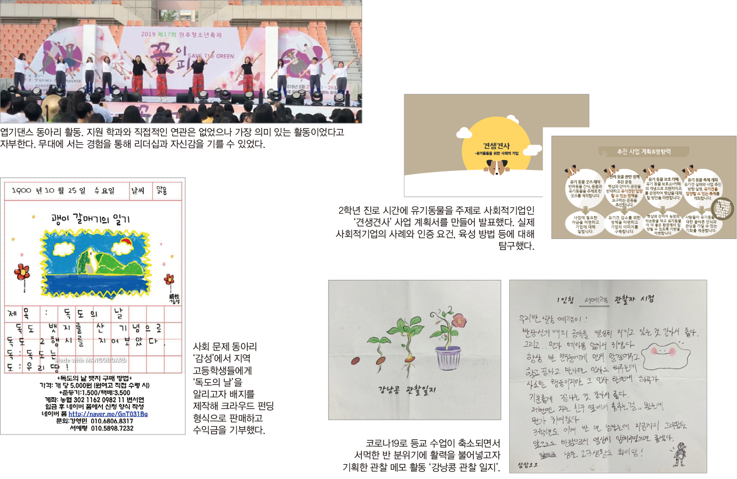 수업 시간에 발표 기회가 있을 때마다 미디어를 활용해 사회 문제를 공론화하는 방법에 몰두했다. ‘청소년 투표권 관련 선거 방법’ 안내 영상이나 학교 체육복 디자인 변경을 주제로 한 사회 UCC 대회 영상도 그런 열정 속에서 탄생했다.