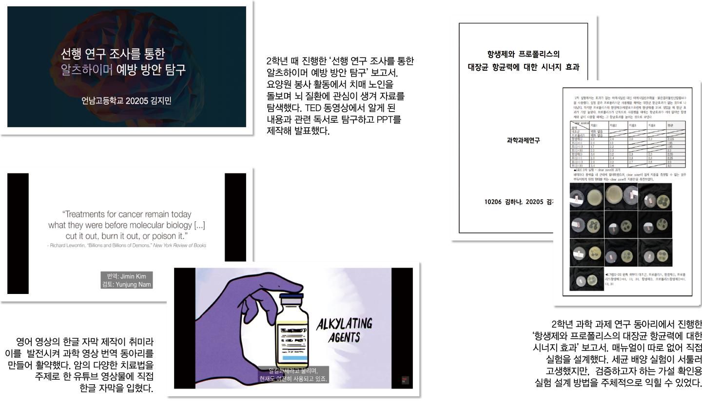 ▒ 창의적 체험 활동 과학 영상 번역 동아리에서 과학 이슈를 소개하는 웹사이트 SciShow의 유튜브 영어 영상 Alzheimer’s Memory Loss(in mice)(7분)와 약리학에 대한 정보를 제공하는 웹사이트 Speed Pharmacology의 영상 Drugs for Alzheimer’s Disease(8분)을 시청하고 분석한 후 우리말로 번역한 자막을 제공해 한국어 자막이 전 세계적으로 서비스될 수 있도록 함.