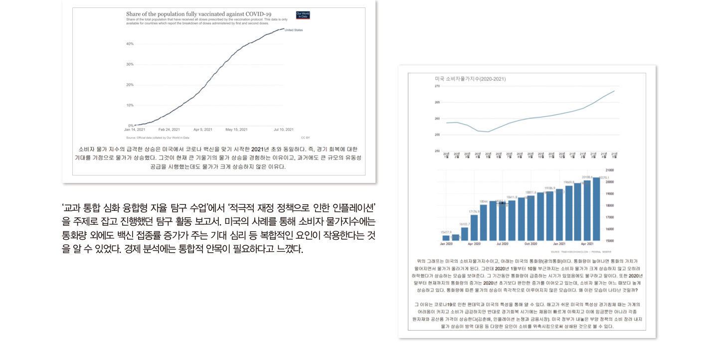 찬희씨의 이 같은 접근은 <미적분> 세부 능력 및 특기 사항에 ‘이과생들에게는 생소한 개념을 쉽게 이해할 수 있도록 해주었음. 미적분이 사회과학 분야에 중요하게 활용되고 있음을 강조함’이라고 기록됐다. 인창고의 학교 특색 프로그램 중에는 ‘교과 통합 심화 융합형 자율 탐구 수업’이 있다. 찬희씨는 이를 활용해 <확률과 통계> <화법과 작문> 교과를 통합, 미국의 사례를 통해 ‘적극적 재정 정책으로 인한 인플레이션’을 주제로 잡고 탐구 활동을 진행했다. 코로나19 이후 무너진 실물 경제를 되살리기 위해 시행한 적극적 재정 정책이 인플레이션을 불러올 것으로 예상했으나, 초기에는 변화가 없다가 최근 대폭 물가가 상승하는 모습을 보면서 앞으로의 전망이 궁금해졌기 때문이다.