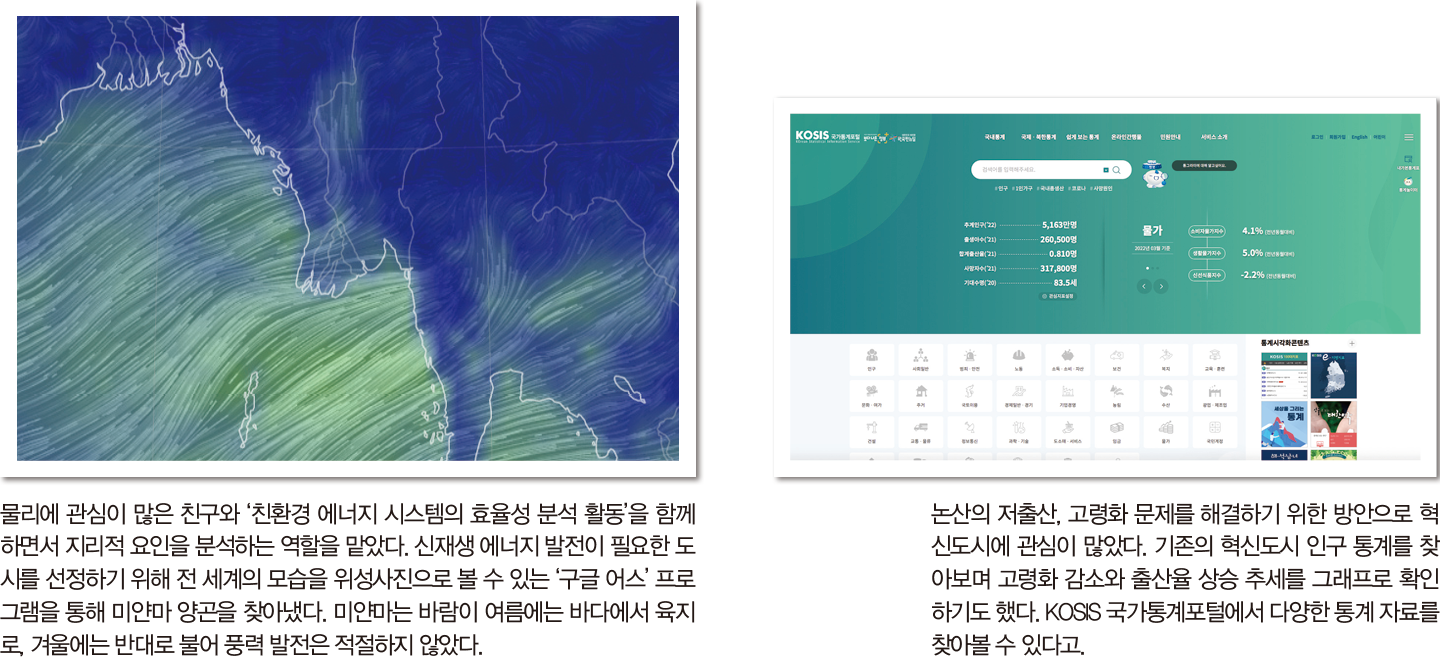 “친환경 에너지의 효율성을 분석할 때 물리학적으로만 접근하면 해석이 잘 안 된다는 친구의 얘기에 제가 지리적 요인을 분석하는 역할을 맡아보기로 했어요. 도시와 토지의 효과적인 이용에 관심이 많았던 때였거든요. 마침 <세계지리>를 배울 때여서 저는 신재생 에너지 발전이 필요한 도시를 선정하고, 필요한 지리 정보를 수집해나갔죠. 여러 국가의 수도를 중심으로 환경오염과 전력 소비율, 보급률 등 몇 가지 기준을 세워 조사해보니 미얀마의 양곤이 눈에 띄더라고요. 에너지 수급이 어려운 반면 인구가 많은 미얀마에서는 나무를 베어 에너지를 얻다보니 환경오염이 심했어요. 구글 프로그램으로 기상 관측 지도를 살펴보니 양곤은 여름과 겨울에 바람의 방향이 바뀌고, 강 하류에 위치해 있어 풍력과 수력이 모두 어려운 조건이더라고요. 태양광 발전이 가장 효율적이라는 결론을 내릴 수 있었죠.”