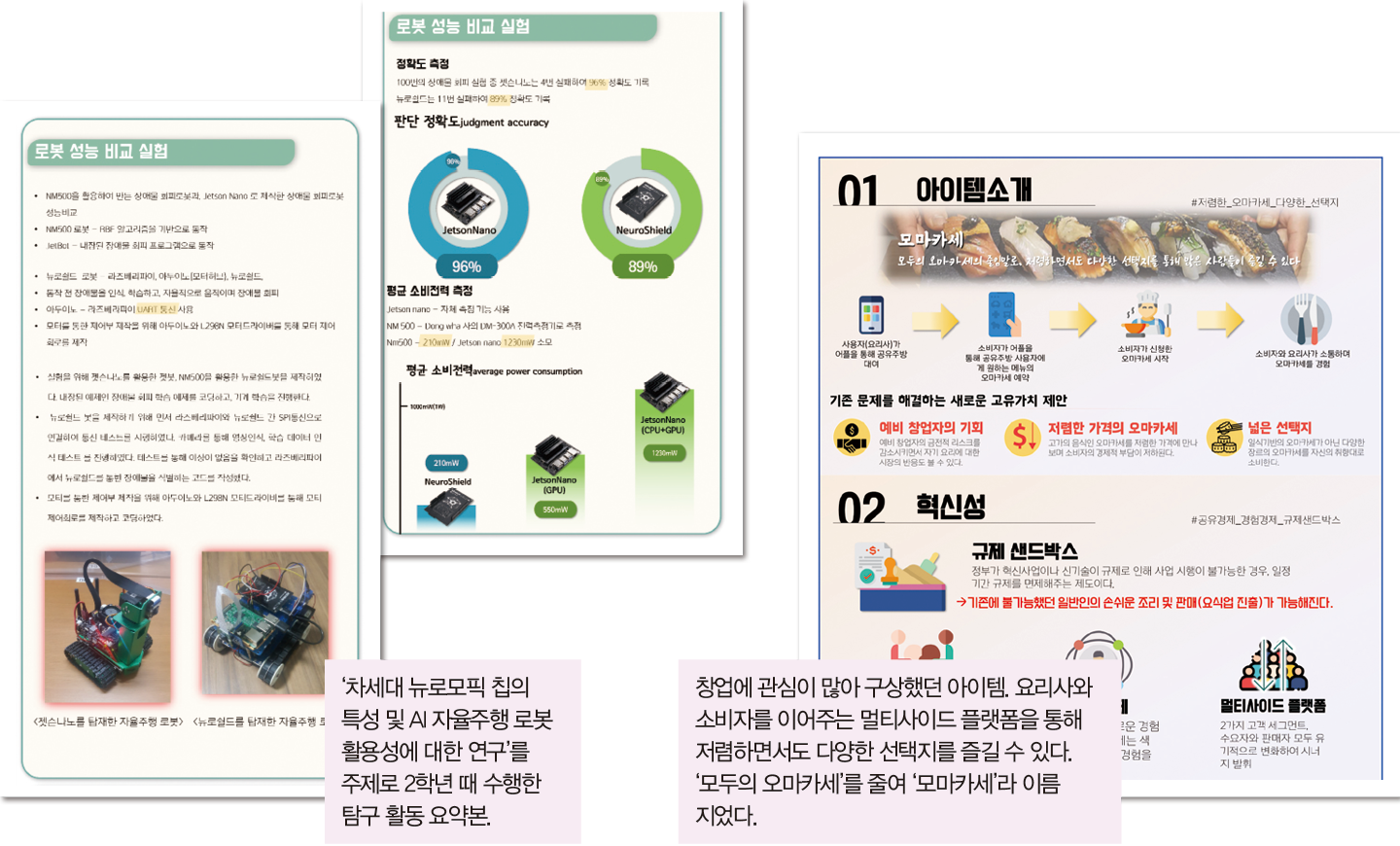 “당시 외식 문화로 ‘오마카세’가 한창 유행했어요. 가격이 비싼 게 흠인 이 경험을 누구나 즐길 수는 없을까 생각하면서 구상했던 아이템이에요. 요리에 재능이 있고, 창의력이 뛰어나도 식당을 열려면 임대료 등 높은 비용이 요구되죠. 이 비용을 줄일 수 있는 대안으로 ‘공유주방’을 떠올렸어요. 요리사는 앱을 통해 공유주방을 대여하고, 소비자는 공유주방 사용자에게 원하는 메뉴의 오마카세를 예약해요. 요리사와 소비자를 이어주는 멀티사이드 플랫폼인 셈이에요. ‘모두의 오마카세’를 줄여 ‘모마카세’라고 이름 지었죠. 실제 요식업에 종사하는 분들 인터뷰도 하고, 전문 투자자의 피드백을 받으며 유튜브에 사업 설명 영상도 만들어 올렸어요. 모의 크라우드 펀딩에서 7억8천만 원을 달성하며 잊을 수 없는 경험이 됐죠.”