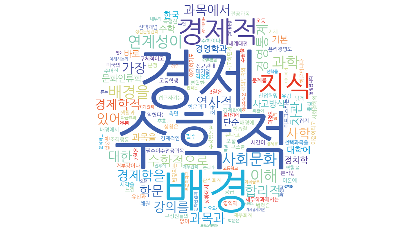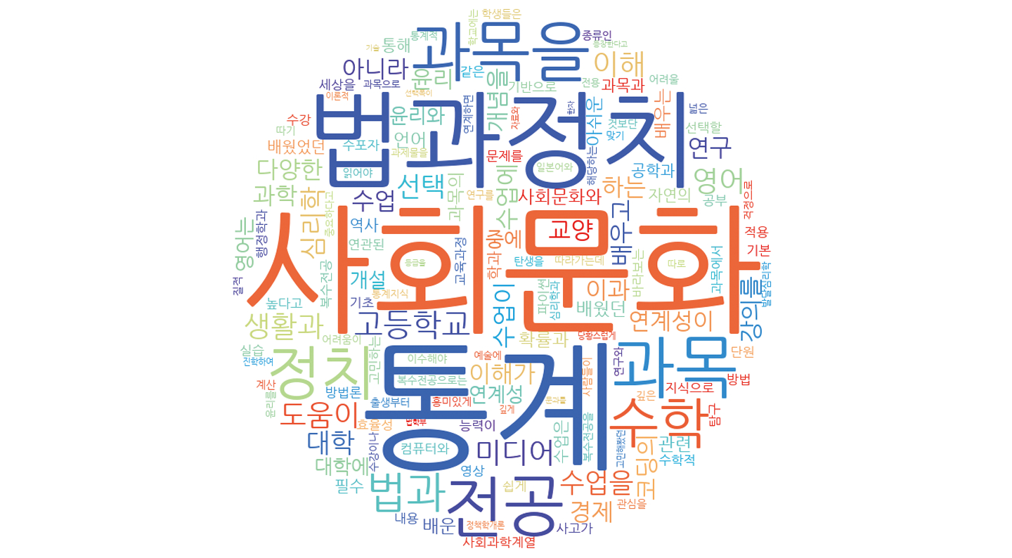 사회과학 계열 전공에 재학 중인 학생들의 의견을 워드클라우드로 확인한 결과, <정치와 법> <사회·문화> 등 사회 과목이 높은 빈도수를 보였다. 사회과학적 연구 방법에 쓰이는 통계를 비롯한 수학적 사고의 중요성도 확인할 수 있다.