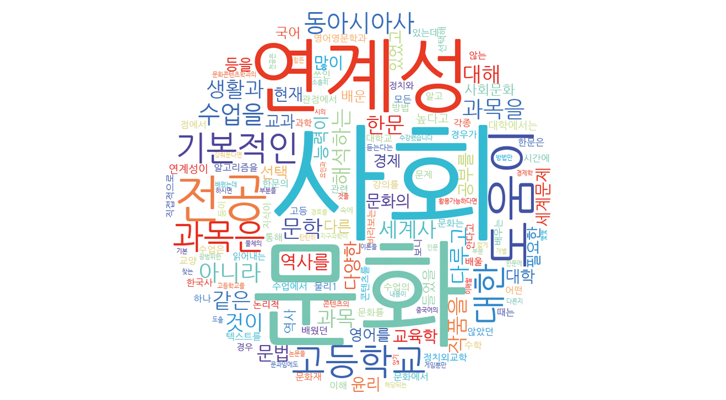 인문·어문 계열 전공에 재학 중인 학생들의 의견을 워드클라우드로 돌려본 결과다. 사회 문제와 이슈를 복합적으로 사고하고, 맥락을 이해하는 관점, 기획력이 필요한 전공 수업의 특성상 사회 과목의 중요성을 보여주듯 ‘사회’ ‘문화’ ‘연계성’ 등의 키워드가 높은 빈도수를 보였다.
