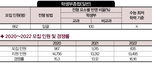 모집 인원은 해마다 증가해왔는데, 작년 경쟁률이 높아졌다는 점을 관심 있게 볼 만하다. 이는 2022학년 수시부터 학교장 추천 전형으로 전환한 점과 무관하지 않다. 경쟁률뿐 아니라 충원율도 일부 모집 단위를 제외하고 대체로 높아졌음을 확인할 수 있다. 이러한 경향은 이번 수시 모집에서도 이어질 것으로 보인다. 지원 자격은 재학생과 재수생으로 제한한다. 또 영재학교나 특성화고와 같이 학생부의 성적 체계가 다른 고교의 학생은 지원할 수 없다. 학교별 추천 가능 인원은 2022년 4월 1일자 학교 알리미 공시 자료 기준으로 3학년 재적 인원의 11%까지이며 계열별 제한 인원은 없다. 성적 산출 과정에서 진로선택 과목은 상위 3개 과목만 반영한다는 점도 고려하자. 학년별 반영 비율은 동일하며 졸업생과 졸업예정자 모두 3학년 1학기까지만 반영한다.