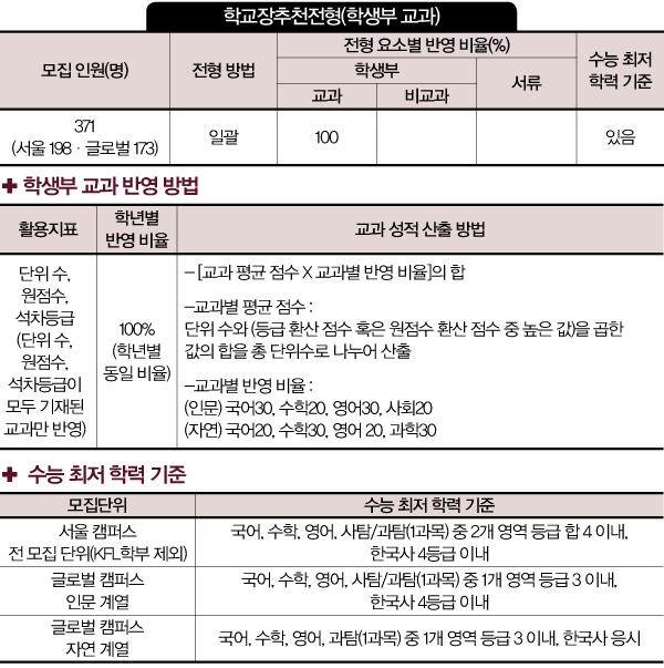 학교장 추천을 받은 학생(졸업생 포함)만 지원할 수 있다. 고교별 추천 인원은 계열 구분 없이 최대 20명 이내로, 학생부 교과 100%로 최종 합격자를 선발하는 일괄 전형이다. 학생부 교과 성적은 학년별 동일 비율로 100% 반영한다. 계열별 해당 교과의 공통·일반선택 과목 전과목이 반영된다. 진로선택 과목은 제외다. 환산점 산출식도 특징이 있어, 지원 시 반드시 한국외대 교과 성적 산출 방법에 의한 교과 환산점을 확인해야 한다. 수도권 주요 대학에 학교장 추천 교과 전형이 모두 있고, 상대적으로 최저 기준이 높지 않아 적극적으로 학교에서 추천을 받아지원해볼 만하다.
