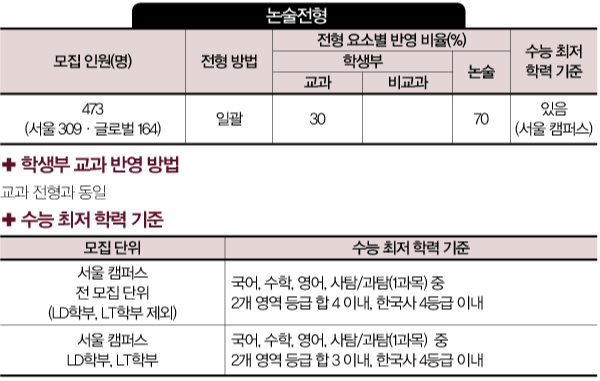 논술 비중이 가장 큰 전형이다. 최저 기준을 서울 캠퍼스에만 적용하며, 이 또한 매우 높은 수준은 아니다. 따라서 논술 실력이 당락을 좌우한다고 볼 수 있다. 논술 가이드북 등을 잘 활용하자. 논술 고사는 수능 이후 11월 26일(토)~27일(일)에 서울 캠퍼스에서 모집 단위별로 실시된다.