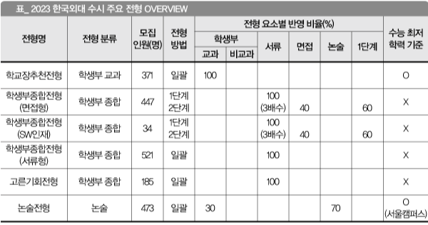 학교장추천전형은 올해부터 출결, 봉사 등 비교과를 반영하지 않고, 학생부 교과만으로 합격자를 선발한다. 글로벌 캠퍼스(자연 계열)에 최저 기준도 도입됐다. 종합 전형 중 면접형과 SW인재에서 면접 반영 비중을 2022학년 30%에서 2023학년 40%로 높였다. 2024학년에는 50%까지 확대된다. 논술 고사는 모집 단위에 따라 인문계 사회계 자연계로 문제유형이 나뉜다. 지난해까지 인문계 사회계 논술고사 시간은 100분, 자연계는 80분이었으나 올해부터 모두 90분으로 통일했다.