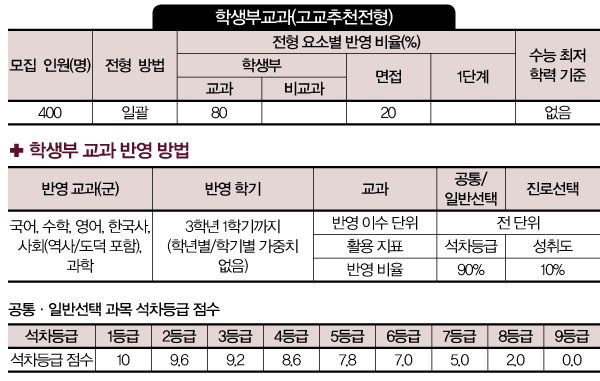 고교추천전형은 학생부 외에 별도의 제출 서류가 없고, 지원자 전원에게 면접의 기회가 주어지며 최저 기준을 적용하지 않는 특징이 있다. 이때 면접은 공통 제시문 없이 진행되는 제출 서류 기반 학생 맞춤형 면접이다. 학생부는 학생이 직접 경험한 활동이나 학습에 대한 질문을 제시하기 위한 자료로 활용하며, 따로 학생부 내용을 평가하지는 않는다. 반면 종합 전형에서는 학생부를 주요 자료로 ‘학업 역량, 학교 활동의 우수성, 발전 가능성’을 평가한다. 지원자들의 교과 성적 차이가 크지 않아 면접 결과에 따라 순위가 변동될 수 있다. 충원율이 높은 전형이기도 하다. 이런 특성상 면접의 영향력은 큰 편이다. 학생부 내용을 꼼꼼하게 숙지하고 예상 질문과 답변을 준비하면 도움이 될 것이다.