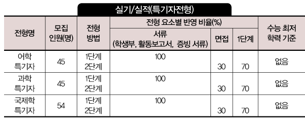 모든 특기자전형이 1단계에서 서류 100%로 4배수의 면접 대상자를 선발하고, 2단계에서 1단계 서류 평가 70%+면접 30%로 선발한다. 고교 재학 중의 교내외 활동을 담은 활동보고서를 제출해야 한다. 면접은 제시문 없는 서류 기반 면접이다. 국제학특기자전형은 영어 강의 수강이 가능한 학생을 모집하기 위해 영어 면접이 진행된다.