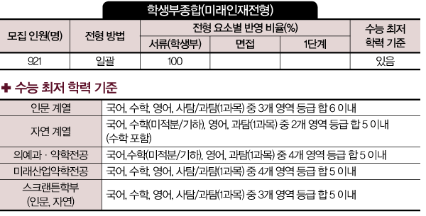 미래인재전형은 서류 100%로 선발하며, 최저 기준을 적용한다.  면접을 실시하지 않고, 올해 자기소개서가 폐지돼 학생부의 중요성이 더욱 강조된다. 최저 기준이 있으며, 인문 계열은 수능 국어 영역, 자연 계열은 수능 수학 영역(미적분, 기하 중 택 1)에  반드시 응시해야 한다. 서류 평가와 더불어 최저 기준 충족이 매우 중요할 것으로 예상된다.