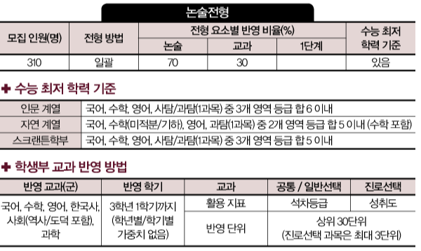 논술 70%+교과 30%로 선발한다. 교과는 이수 과목 중 상위 30단위(진로선택 과목은 최대 3단위까지 포함)를 반영한다. 고교 추천 전형과 급간 점수 차이가 있으니 유의하자.  논술의 경쟁력이 가장 중요한 전형이다. 논술 고사는 11월 26일(토)~27일(일)에 실시되며 시간은 100분이다. 출제 유형 등 자세한 사항은 입학처 홈페이지에서 확인해야 한다.
