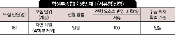 인문계와 약학부는 선발하지 않는다. 약학부를 제외한 자연 계열은 숙명인재Ⅰ 전형(서류형)으로만 선발한다. 숙명인재Ⅰ 전형(서류형)의 평가 항목은 전공 적합성 및 발전 가능성 500점, 탐구 역량 300점, 공동체 의식과 협업 능력 200점이다. ‘전공 적합성 및 발전 가능성’에서는 진로 탐색 노력, 전공에 대한 관심과 이해, 전공(계열) 역량 개발을, ‘탐구 역량’에서는 지적 호기심, 자기 주도성, 탐구 활동, 기초 학업 역량을, ‘공동체 의식과 협업 능력’에서는 공동체 의식 및 리더십, 협업 능력 및 소통 능력을 평가한다. 진로를 탐색하는 과정에서 어떤 노력을 기울였는지, 학교 활동을 통해 지원 전공과 관련한 소양과 자질을 제대로 보여주었는지, 전공(계열) 관련 교과목을 적극적으로 이수했는지 등을 토대로 지원자 본인의 서류에 담긴 경쟁력이 어느 정도인지 검토할 필요가 있다.