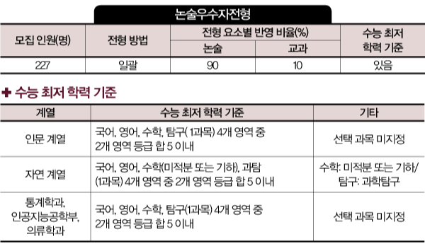 논술 시험 반영 비율이 70%에서 90%로 상향돼 학생부 교과 성적에 대한 부담이 줄었다. 논술 시험은 통합 논술형으로 출제되며 인문 계열은 2문항, 자연 계열은 3문항이 출제된다. 통합 논술형이란 제시문 혹은 자료의 기술 양식, 제재 혹은 논제의 성격 등이 인문·사회과학적 특성과 자연과학적 특성이 통합된 형태라 할 수 있다. 단순한 독해 능력뿐만 아니라 다양한 도표 자료 등을 활용해 분석하는 능력을 종합적으로 평가한다. 자연 계열은 풀이 과정이나 정답을 요구하는 수리적 문제가 출제된다.