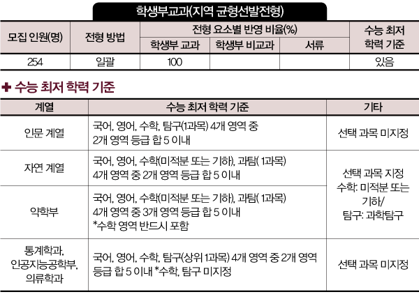 2021 대비 2022 경쟁률은 상승했다. 2021학년에는 244명 모집에 1천488명이 지원해 경쟁률이 6.10:1었지만, 2022학년에는 246명 모집에 2천197명이 지원해 8.93:1이었다. 올해 인공지능공학부를 신설했다. 인공지능공학부는 인간 중심의 사고를 바탕으로 응용 SW 개발자를 양성하는 자연 계열이지만 최저 기준에서 수학과 탐구 과목을 지정하지 않아 <확률과 통계>와 사회탐구를 선택해도 지원할 수 있다. 인문 계열과 자연 계열 모두 국어, 수학, 외국어(영어), 사회(역사/도덕, 한국사 포함), 과학 교과의 석차등급이 표기된 모든 과목을 반영한다. 2022년 2월 이후 졸업(예정)자의 경우 진로선택 과목은 상위 3과목 성취도를 등급으로 변환해 반영한다. 제2외국어 과목은 반영하지 않지만 국어, 수학, 영어, 사회, 과학 관련 전문 교과는 포함한다. 단, 체육교육, 미술대학은 국어, 외국어(영어), 사회(역사, 도덕, 한국사 포함) 교과를 반영한다.