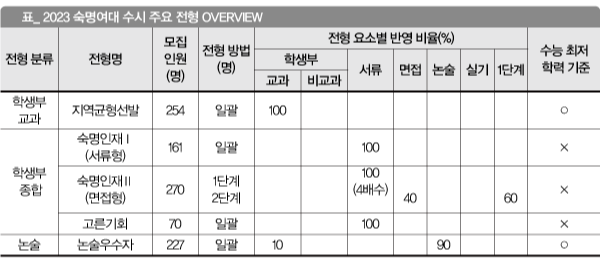 숙명인재Ⅰ(서류형), 숙명인재Ⅱ(면접형)를 운영한다. 2023학년에는 서류형은 약학부를 제외한 자연 계열만, 면접형은 약학부와 인문 계열을 선발한다. 2022학년에는 한 모집 단위를 서류형과 면접형으로 나눠 선발했다. 정시 확대로 종합 전형이 5.9% 축소된 상황에서 전형을 구분해 선발하려니 모집 인원이 너무 적었다. 모집 인원이 적으면 수험생 입장에서는 부담스러울 수밖에 없다. 모집 인원을 확보하기 위해 모집 단위별로 전형을 구분하는 것이 좋겠다고 판단했다.