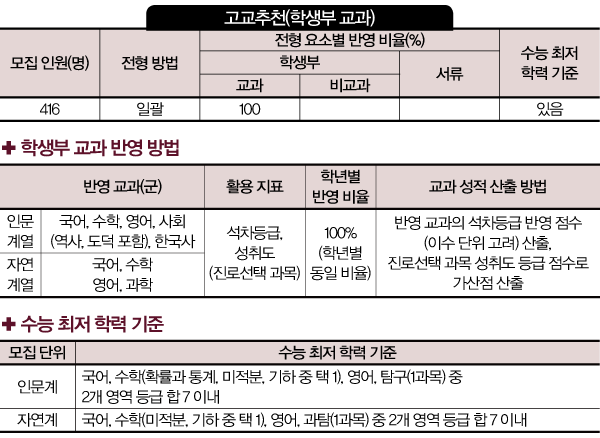 학교장의 추천을 받은 학생(졸업생 포함)만 지원할 수 있는 전형으로, 고교별 추천 인원은 계열 구분 없이 최대 10명이며 학생부 교과 100%로 일괄 선발한다. 교과 성적의 학년별 반영 비율은 같다. 인문 계열은 국어 수학 영어 사회(역사, 도덕 포함) 한국사, 자연 계열은 국어 수학 영어 과학 교과를 반영한다. 반영 교과 전 과목의 석차등급 반영 점수(이수 단위 고려)를 산출하고 진로선택 과목은 가산점을 부여한다. 특히 자연 계열의 경우 지정 교과인 기하, 물리학Ⅱ, 화학Ⅱ, 생명과학Ⅱ, 지구과학Ⅱ 중 2과목 이상 이수한 지원자들에게 지정 교과 중 상위 성취도 2과목과 기타 진로선택 과목 중 최상위 성취도 1과목의 가산점을 산출해 반영한다. 최저 기준은 인문 계열은 국어, 수학(확률과 통계, 미적분, 기하 중 택 1), 영어, 탐구(1과목) 중 2개 영역 등급 합 7 이내, 자연 계열은 국어, 수학(미적분, 기하 중 택 1), 영어, 과탐(1과목) 중 2개 영역 등급 합 7 이내이다.