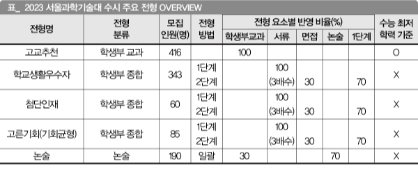 학교생활우수자전형과 첨단인재전형으로 403명을 선발한다. 고른기회전형 모집 인원을 많이 늘려 85명을 정원 내로 선발한다는 점도 특징이다. 서류 평가 기준은 인성, 학업 역량, 전공 적합성, 발전 가능성 등이다. 이 중 전공 관련 과목 이수와 성취도, 전공에 관한 관심과 이해, 전공 관련 활동과 경험을 평가하는 전공 적합성의 비율이 32%로 가장 높다. 올해부터는 자기소개서도 받지 않는다. 문항 수와 글자 수가 줄면서 변별력이 크게 낮아졌고 지난 학년 입학생을 대상으로 시뮬레이션해본 결과 자기소개서를 빼고도 결과는 비슷했다.