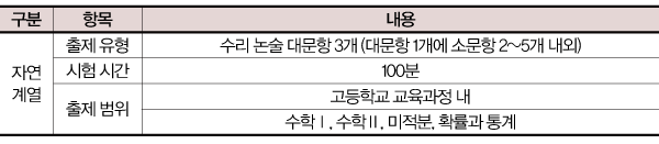 전년과 같이 인문 계열에서는 모집하지 않고, 자연 계열에서만 교과 30%와 논술 70%로 선발한다. 최저 기준이 없음을 고려하면 논술 실력이 당락을 좌우함을 알 수 있다. 특히 기본점수 없이 논술 최고점 700점, 최저점 0점으로 설정하고, ‘절대평가’임을 밝히고 있다. 선행학습 영향 평가 보고서(기출문제, 예시 답안 등)와 논술 가이드북 등을 잘 활용하자. 주말에 대학별 논술 고사가 집중되어 있는 데 반해, 서울과학기술대는 수능 이후인 11월 21일(월)~22일(화) 양일간 실시할 예정이다. 단, 정확한 일정은 입학처 홈페이지에서 확인해야 한다. 지난해와 같이 출제 범위에 <기하>가 포함되지 않는다.