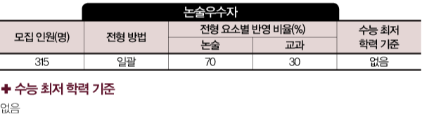 논술우수자전형은 죽전 캠퍼스에서만 운영한다. 수리 논술은 풀이 과정과 답을 모두 적어야 하므로 평상시 풀이 과정을 꼼꼼하게 작성하는 연습이 필요하다. 답이 틀리더라도 풀이 과정에서 부분 점수를 주므로 최선을 다하는 자세가 중요하다. 논술 전형에서는 최저 기준을 설정하지 않았다. 입학처 홈페이지에 탑재된 모의논술 문제를 실전과 같은 환경에서 풀어보고 가이드 답안을 철저하게 분석한 뒤 논술 고사 강평 영상을 참고해 본인의 부족한 부분을 보완한다면 논술 고사에서 좋은 결과를 얻을 수 있다. 논술 전형 가이드북과 선행평가 영향 보고서도 꼼꼼하게 읽어보길 바란다.