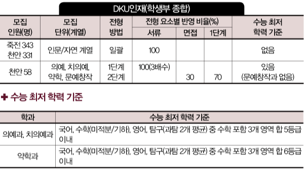 DKU인재전형은 죽전 캠퍼스 343명, 천안 캠퍼스 389명을 모집한다. 의예, 약학, 치의예, 문예창작과를 제외한 인문·자연 계열 학과들은 서류 100%로 선발한다. 반면 이들 학과는 서류 100%로 3배수를 1단계에서 선발한 뒤 2단계에서 면접 30%와 1단계 성적 70%를 합산한다. 일괄 전형과 단계별 전형의 서류 평가 방식은 학업 역량 40%, 전공 적합성 40%, 인성 및 발전 가능성 20%를 정성적으로 평가한다. 학업 역량에는 학업 성취도 20%, 탐구 능력 20%가, 전공 적합성에는 전공 의지 20%, 전공 관련 활동 20%가, 인성 및 발전 가능성에는 성실성 및 공동체 의식 10%, 리더십 및 협업 능력 10%가 반영된다. 의예, 치의예, 약학, 문예창작과는 2단계에서 면접을 진행한다. 1인당 7분 이내의 블라인드 평가로 학생부를 기반으로 한 질의응답을 통해 서류 사실 여부, 전공 의지, 전공 관련 활동, 전문(의료, 약학, 창작)인으로서의 발전 가능성, 인성 등을 종합 평가한다. 면접은 전공 적합성 40%, 발전 가능성 30%, 인성 30%를 반영하며 면접 절차와 면접 문항 예시는 수시 모집 요강에서 확인할 수 있다. 최저 기준은 의예과, 치의예과, 약학과에만 적용한다. 의예과, 치의예과는 국어, 수학(미적분/기하), 영어, 탐구(과탐 2개 과목 평균) 중 수학 포함 3개 영역 합 5등급 이내이며, 약학과는 수학 포함 3개 영역 합 6등급 이내이다.