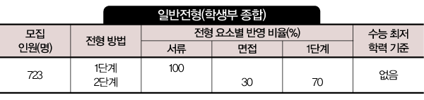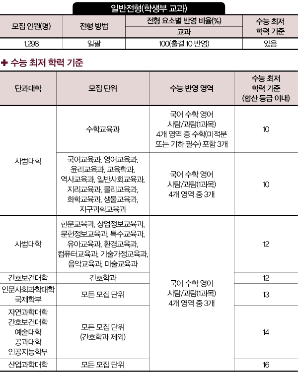 고교 졸업(예정)자 또는 이와 동등 이상의 학력이 있다고 인정되는 수험생이 지원 가능하다. 학생부 교과 지역인재전형이 소속 고교에 대한 지역 제한이 있는 것과 달리 어느 지역 학생이나 지원 가능하다. 학생부 교과 성적 90%+출결 10%를 반영하고 최저 기준을 고려해 선발하는 일괄 전형이다. 사범대학은 올해부터 면접이 폐지됐다. 반영 교과 및 과목은 전 교과 전 과목으로 3학년 1학기까지의 성적을 반영한다. 단, 9등급제로 표기된 과목의 성적만 반영하며, 진로선택 과목은 미반영함을 유의해야 한다. 출결 10%는 미인정 결석이 3일 이상일 때 단계적으로 감점된다. 미인정 지각, 미인정 조퇴, 미인정 결과는 3회를 1일 결석으로 한다. 최저 기준이 굉장히 복잡하다. 지원 학과의 최저 기준을 반드시 확인하라.