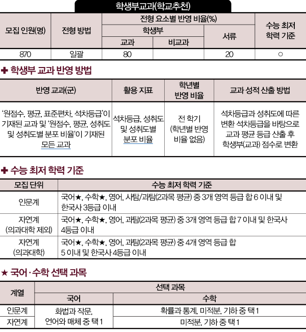 지난 4월 1일 학교 알리미 공시 자료 기준 3학년 재적 학생 수의 4%까지 추천할 수 있다. 계열별(인문·자연)로 지원 인원을 제한하지 않는다. ‘선(先) 지원 후(後) 추천’ 방식이라 지원 전 출신 고교와 사전 협의해야 한다. 학업 우수형, 계열 적합형과 복수 지원이 가능하다. 일괄 전형으로 교과의 영향력이 매우 크고, 면접이 없으며 합격 시 정시 지원 기회가 사라진다는 점을 알아두어야 한다. 한편 교과 평가에 진로선택 과목도 포함된다. 성취도 외 누적 학생 비율에 따라 교과 환산 점수가 바뀌는 만큼 최대한 A 성취도를 받는 것이 중요하다.