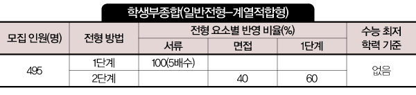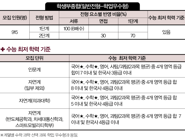 국내외 정규 고등학교 졸업(예정)자라면 지원이 가능하다. 학교 추천이나 계열 적합형과 복수 지원이 가능하다. 1·2단계 모두 서류 평가 비중이 커 평가 요소·방법을 잘 확인해야 한다. 학업 역량 50%, 자기계발 역량 30%, 인성 20%를 반영하는데, 학업 역량 부분이 계열 적합형 40%보다 다소 높게 측정돼 있음에 유의하자. 2단계에서는 면접을 진행한다. 준비 12분, 면접 6분으로 제시문 기반 면접으로 진행된다. 답변을 토대로 분석력 20%, 적용력 30%, 종합적 사고력 40%, 면접 태도 10% 등을 종합적으로 살펴 ‘매우 우수(A+)-우수(A)-보통(B)-미흡(C)-매우 미흡(D)-부적격(F)’의 6점 척도로 평가한다. 1단계 합격자 발표는 수능일인 11월 17일(목) 오후 5시다. 인문계가 11월 26일(토), 자연계가 11월 27일(일)에 면접을 실시한다. 수능 이후에 참여 여부를 결정할 수 있다. 2021학년엔 1단계 합격자 중 56.3%, 2022학년엔 1단계 합격자 중 48.1%만 최저 기준을 충족했다. 면접 결시율도 30%에 달해 전년도 실질 경쟁률은 1.98:1까지 하락했다. 즉 최저 기준 충족이 합격의 최대 관건이다.