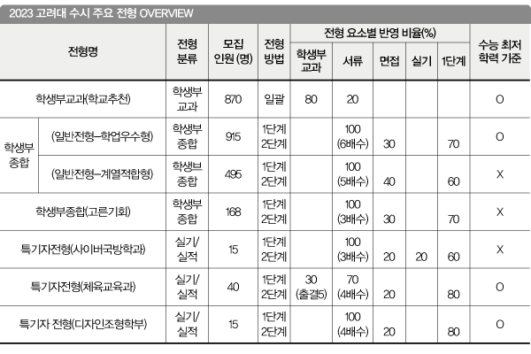 2023학년 고려대 수시 모집은 지난해와 거의 비슷하다. 학생부 교과 전형인 학교추천전형과 학생부 종합 전형인 일반전형(학업우수형, 계열적합형)의 큰 틀을 유지한다. 다만 평가 역량에 새로운 요소가 추가됐다는 점은 주목할 만하다. 종전의 학업 역량에 ‘학업 의지’ 항목이 신설돼 영향력을 발휘할 것으로 전망된다. 학교추천전형의 수능 최저 학력 기준을 변경한 점과 스마트모빌리티학부, 차세대통신학과 등 신설 계약학과에서 학생을 모집한다는 점도 눈여겨봐야 한다. 고려대 인재발굴처 최미정 책임입학사정관에게 2023 수시에서 꼭 짚어야 할 부분을 들었다.