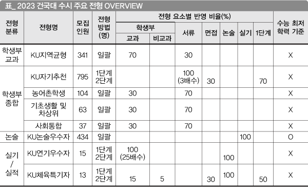 2021 대입까지 종합 전형인 KU학교추천으로 서류 70%+학생부 교과 30%를 반영해 선발했지만, 2022학년 대입에서는 학생부 교과 100%로 선발하는 교과 전형으로 변화를 줬다. 경쟁률은 26.62:1로 높았다. 경영학과와 컴퓨터공학과 등 인기 학과는 경쟁률이 40:1에 달했다. 경쟁률이 높아지면서 합격생의 학생부 교과 성적이 높아졌지만, 충원율도 예년 대비 2배가량 높았다. 2023 수시에서 교과 100%가 아닌 학생부 교과 성적 70%(정량 평가)와 서류 평가 30%(정성 평가)로 선발한다. 수치상으로는 교과 성적 반영 비율이 절대적으로 높지만, 정성 평가의 영향력도 상당할 수 있다. 모든 진로선택 과목을 정성 평가로 반영하므로, 단순히 진로선택 과목의 성취도뿐만 아니라 전공 관련 교과 이수 노력, 세부 능력 및 특기 사항에 기재된 내용까지 종합적으로 분석할 필요가 있다. 수능 최저 학력 기준이 폐지돼 모의고사 성적과 관계없이 학교생활을 성실하게 한 우수한 학생들이 대거 지원할 가능성도 높다.