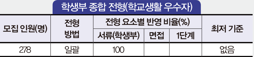 1단계 서류 평가에서 인성, 전공 적합성, 학업 역량, 발전 가능성 등 네 가지 평가 요소로 평가한다. 다른 평가 요소는 20%로 동일한데 학교생활 우수자 전형은 학업 역량이 40%, 자기 주도 인재 전형은 전공 적합성이 40%를 차지한다는 점이 다르다. 각 전형의 인재상이 다르기 때문이다. 자기 주도 인재 전형은 전공 분야에 확고한 목표 의식과 열정을 가진 학생을, 학교생활 우수자 전형은 학업과 다양한 활동을 통해 균형 있는 학교생활을 충실히 한 학생을 선발하고자 한다. 전년 최종 등록자의 산포도와 최저 등급을 홈페이지에 공개했으니 참고하기 바란다. 중복 지원이 가능하니 두 전형 모두 지원해도 된다. 면접이 부담스러운 학생은 학교생활 우수자 전형에 지원하는 것도 방법이다. 올해부터 학교생활 우수자 전형에서 면접이 없어졌다는 점을 꼭 기억하기 바란다.