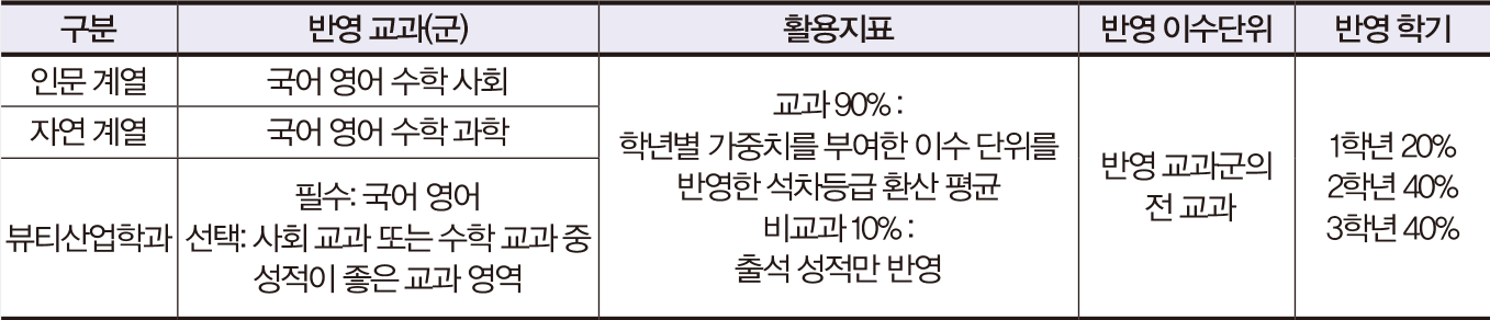 교과 우수자 전형은 국내 고등학교 졸업(예정)자로서 국내 고등학교에서 3개 학기 이상 성적을 취득한 학생만 지원 가능하다. 212명을 모집하며 학생부 교과 성적을 90%, 비교과 성적 10%를 반영한다. 교과 성적은 학년별 교과목 이수 단위의 반영 비율이 1학년 20%, 2학년 40%, 3학년 40%로 가중치를 부여한다. 재학생은 3학년 1학기 성적이 40% 반영되기에 3학년 1학기 교과 성적이 가장 중요하다. 졸업생의 경우 3학년 전체 성적을 40%로 반영한다는 점에 주의해야 한다. 비교과 성적은 출석 성적만 반영하며, 미인정에 의한 결석 지각 조퇴 결과만을 점수화한다. 최저 기준은 인문 계열은 2개 합 6 이내, 자연 계열은 2개 합 7 이내다. 탐구는 상위 1과목을 반영한다. 영어 영역을 포함할 경우 인문 계열은 2개 합 5, 자연 계열은 2개 합 6 이내로 최저 기준이 조금 더 엄격해지는 것에 주의하자.