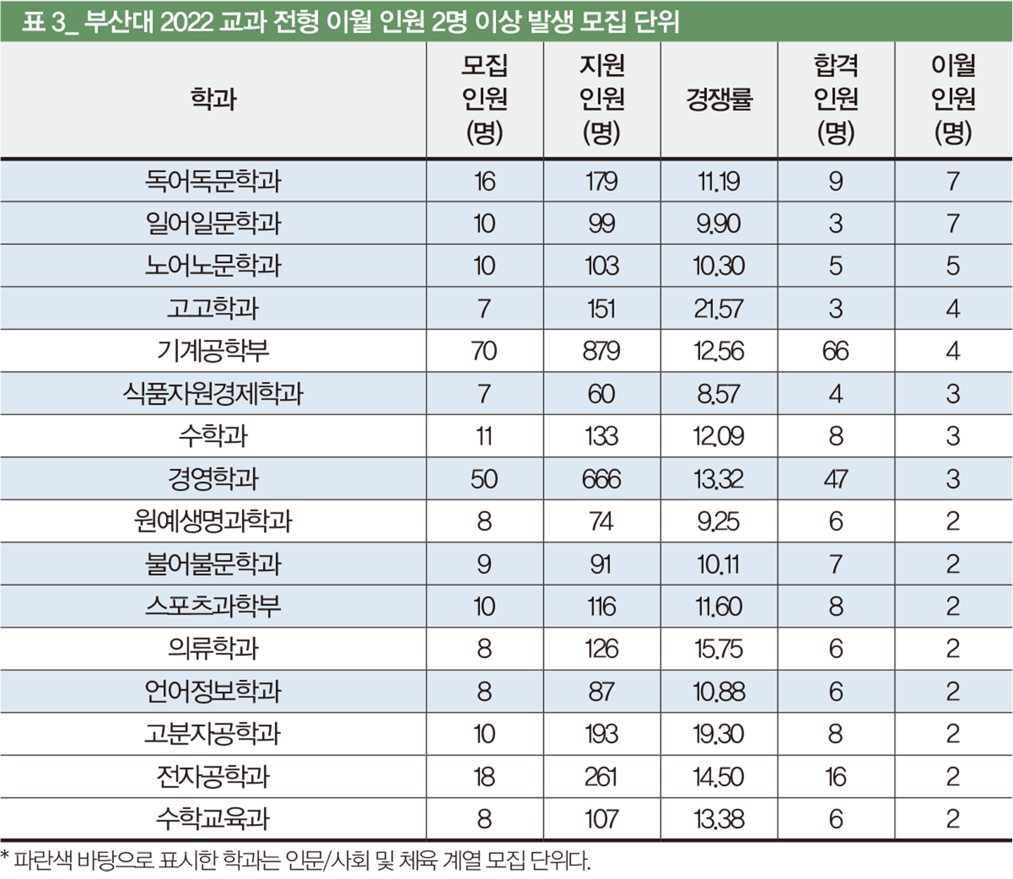 자연 계열 모집 단위 이월 인원 감소 현상은 2021학년, 2022학년 교과 전형에서 이월 인원이 2명 이상 발생한 모집 단위를 통해 확인할 수 있다. 2021학년에 5명 이상 이월 인원이 발생한 모집 단위는 16개로 이 중 인문·사회/체육 계열이 12개, 58명으로 전체 211명의 27.5%를 차지한다. 하지만 2022학년에는 5명 이상 이월 인원이 발생한 모집 단위 3개 모두 인문·사회/체육 계열이다(표 3). 또한, 2명 이상 이월 인원이 발생한 모집 단위 중 인문·사회/체육 계열 모집 단위가 33명으로 전체 52명의 63.5%에 달한다. 결국 2021학년과 비교해 최저 기준을 충족하기가 인문·사회/체육 계열은 더 어려웠던 반면, 자연 계열은 어려움이 상대적으로 적었다고 볼 수 있다.