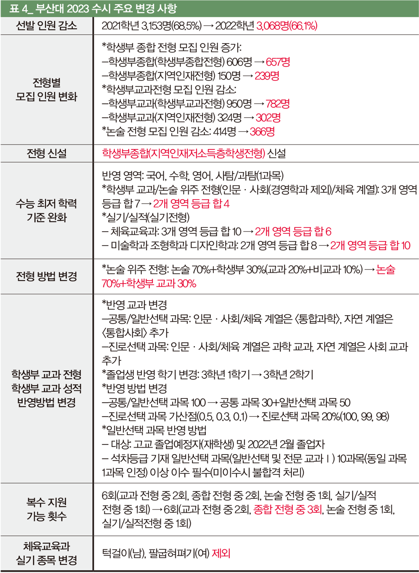 부산대 2023학년 수시 모집은 지난해 전형 틀을 유지하되, 모집 인원 및 전형 방법에 조금씩 변화가 있다(표 4). 주요 변경 사항을 보면 우선 수시모집 선발 인원 전체는 2022학년 3천153명에서 3천68명으로 감소했다.