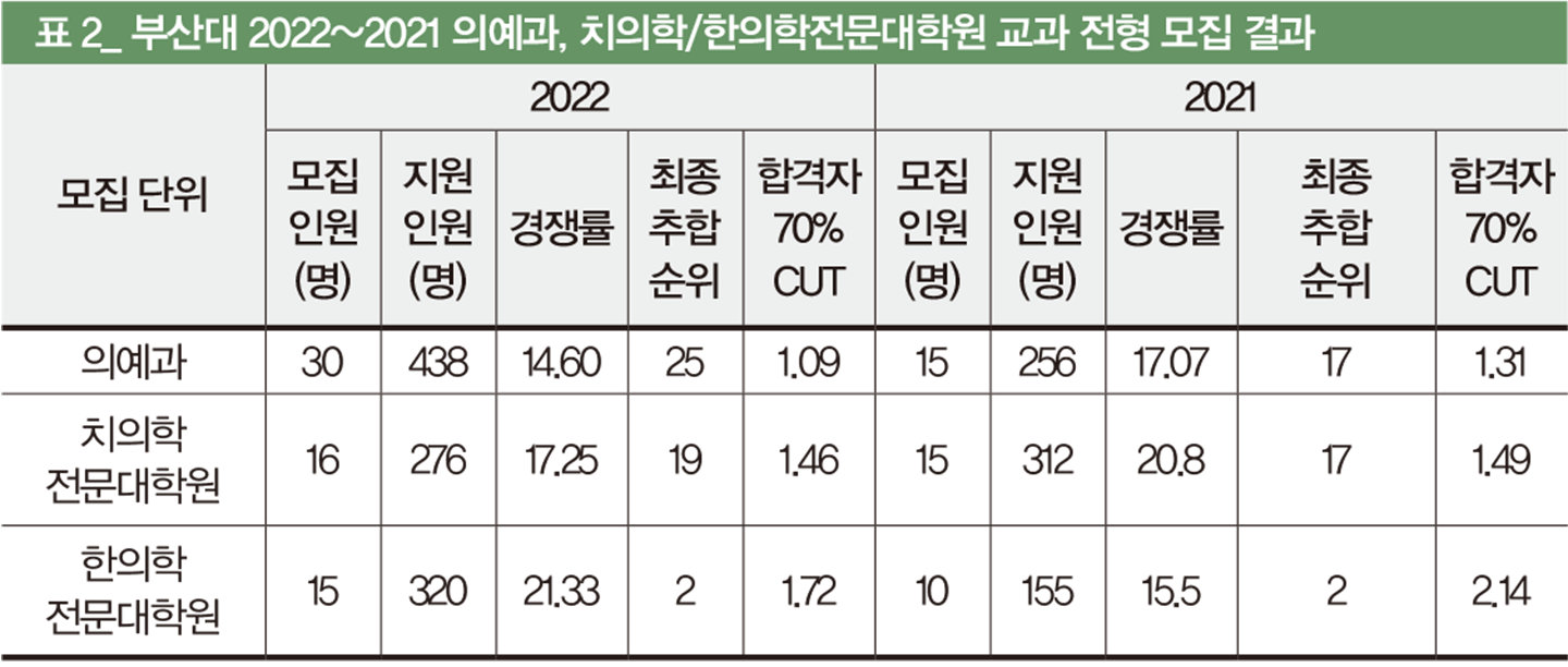 ‘표 2’는 2021~2022학년 의예과, 치의학/한의학전문대학원(학·석사 통합 과정) 입시 결과다. 의예과, 한의학전문대학원의 70% 등급 CUT이 대폭 올랐고, 치의학전문대학원의 70% 등급 CUT도 소폭 높아진 것은 최저 기준 충족률 상승의 결과로 보인다. 또한 2015 개정 교육과정의 본격 적용으로 인해 2021학년 대입에서 등급 산출이 됐던 진로선택 과목이 2022학년에는 성취도 산출로 변경된 것도 영향을 미쳤다.