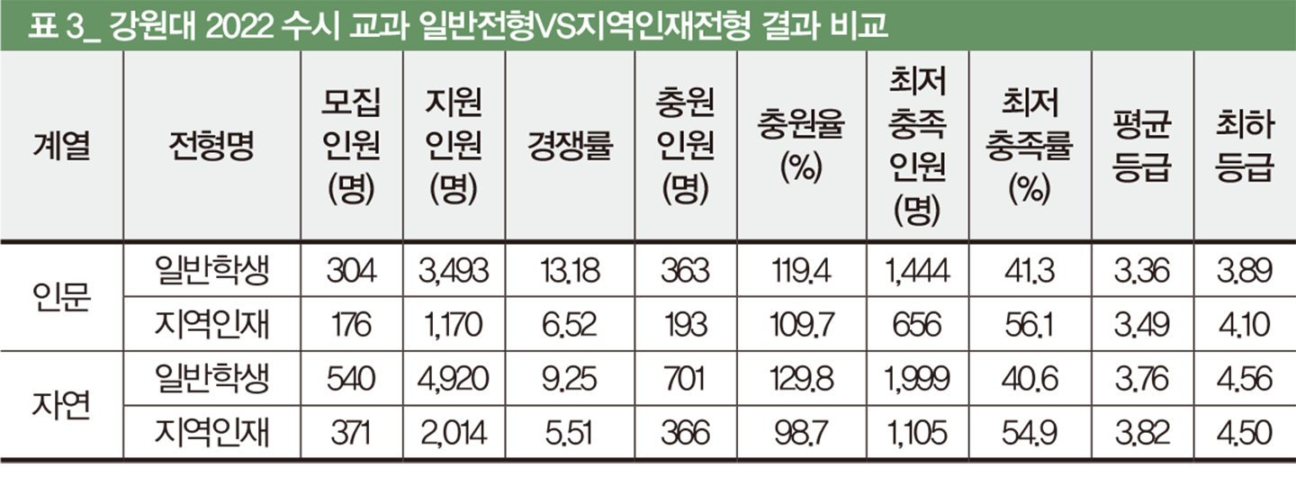 강원대가 발표한 2022 수시 교과 전형 결과를 분석하면 최저 충족률과 충원 합격률 등으로 인해 인문 계열은 합격자 간 교과 성적 편차가 지난해에 비해 축소됐다. 반면 자연 계열은 약대 신설, 최저 기준의 완화 등의 영향으로 비선호 학과 지원자의 교과 등급이 낮아지며 합격자 간 성적 편차가 확대되는 양상을 보였다.