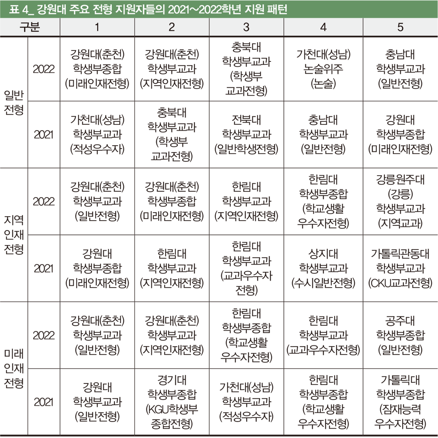 강원대 수시에 도전하는 학생들의 지원 경향은 매우 다양하다. ‘표 4’는 2021~2022학년의 지원 경향을 정리한 자료다. 교과 전형인 일반전형과 지역인재전형, 종합전형인 미래인재전형의 지원 양상이 조금씩 다름을 확인할 수 있다.