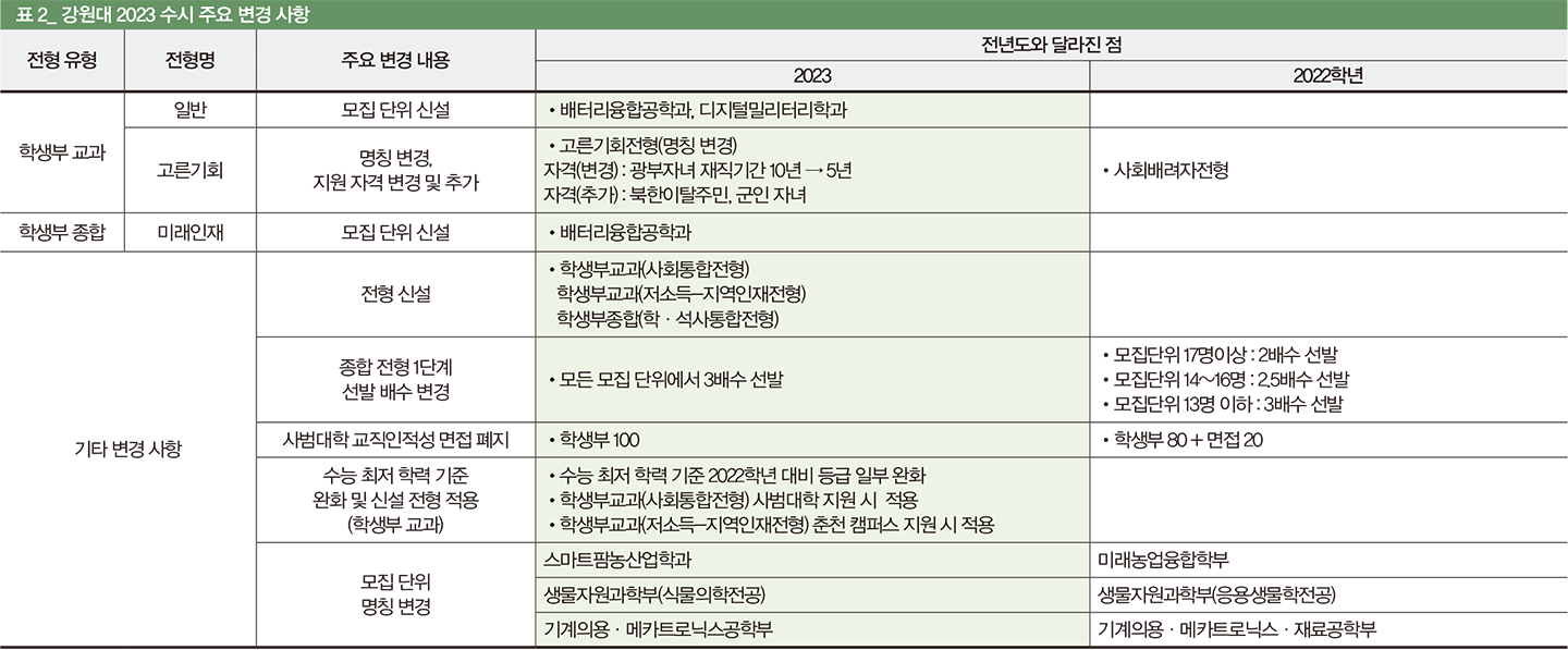강원대 2023학년 수시 모집은 약학과의 신설, 계열별 반영 교과의 변화, 교과 전형 중 일반전형과 지역인재전형의 중복 지원 허용 등의 뚜렷한 변화가 있었던 지난해와 다르게 주목할 만한 큰 변화는 보이지 않는다.