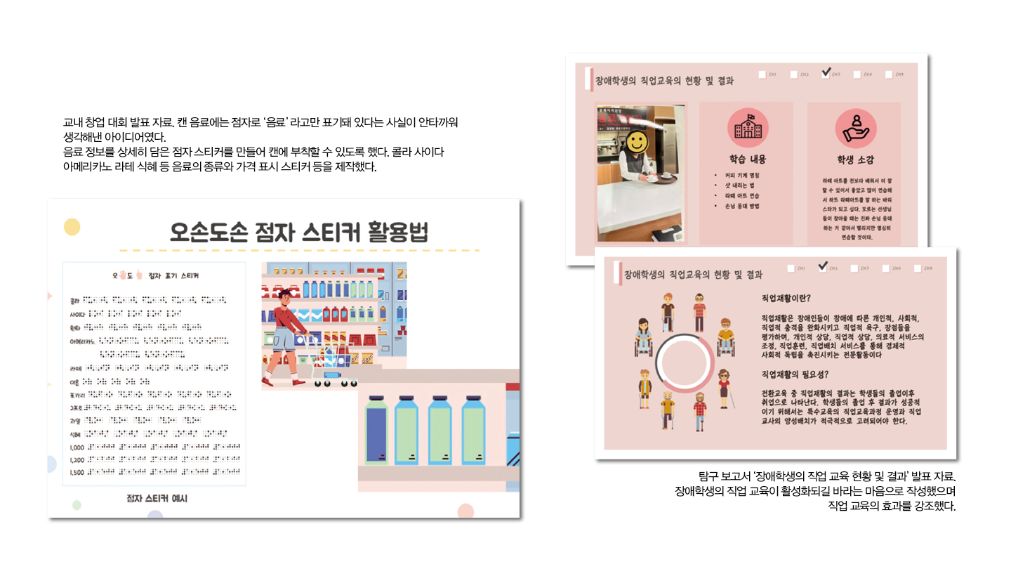 “캔 음료에는 점자로 ‘음료’라고만 표기돼 있어요. 어떤 맛의 음료인지, 탄산이 포함돼 있는지 등 시각장애인들이 음료 정보를 구체적으로 알기 힘들죠. 안타까운 마음에 음료 정보를 상세히 담은 점자스티커를 만들어 캔에 부착할 수 있도록 했어요. 장애인 친구들과 긴 시간 함께하면서 그들의 시각으로 세상을 바라보니 해결해야 할 문제들이 좀 더 보이더라고요. 특수교육 교사가 돼 그들이 삶의 주체이자 훌륭한 사회의 일원으로 성장할 수 있도록 돕고 싶습니다.”