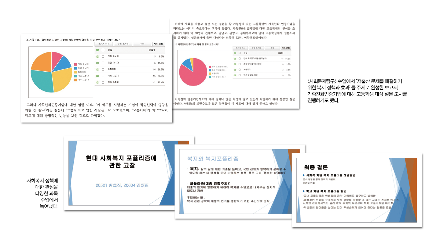 “자녀 출산과 양육 지원, 유연근무 제도, 가족친화 직장 문화 조성 등 가족친화 제도를 모범적으로 운영하는 기업과 기관 등을 심사해 여성가족부가 인증을 부여하는 제도더라고요. 우리 학교를 비롯해 다른 학교 학생들의 협조를 얻어 약 50명을 대상으로 설문 조사를 진행했어요. 대체로 잘 모르고 있었지만, 어떤 제도인지 설명하고 이 기업들이 직업 선택에 영향을 미칠 것 같냐는 질문에 절반이 넘는 학생들이 긍정적인 반응을 보였어요. 선생님께서 <사회·문화> 수업 때 배운 자료 조사 방법 중 면접 심층 인터뷰 기법을 연결해 설명해주셨기 때문에 진행하는 데 도움이 많이 되더라고요. ‘만만치 않은 수업’으로 유명했기에 이 과목을 선택한 학생이 33명 정도였지만, 진짜 ‘공부’를 하는 느낌이어서 정말 재미있게 했던 것 같아요.”