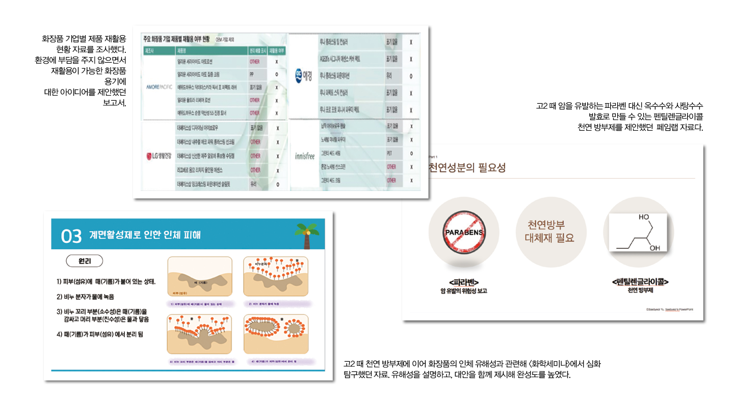 화장품에 관한 관심을 여러 과목에 접목하는 건 어렵지 않았다. <생활과 윤리>는 자연 계열의 사회 교과 1개 과목 필수 이수로 선택했지만, 동물 실험이나 생명 윤리에 대한 고민으로 이어졌다.