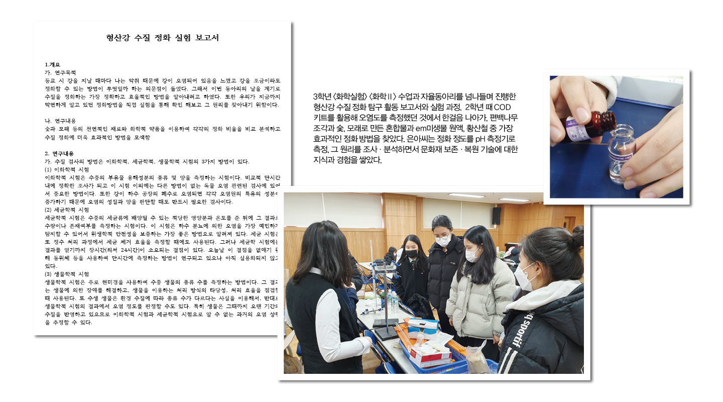 “등굣길 하천 근처에서 악취가 났어요. <생명과학Ⅰ> 수업을 들으면서 원인을 알아보고 싶었죠. 마침 <생명과학실험> 수업을 들으며 마이크로피펫 원심분리기 분별깔대기 U자관 등의 도구를 이용한 효소의 촉매 반응, PCR 등의 다양한 실험에 빠져 있기도 했고요. 단순 측정만 하면 의미가 없을 것 같아 산화제인 과망간산칼륨을 이용해 COD 원리를 분석하고 정리해 부원들에게 알려줬어요. 덕분에 좀 더 진지한 실험이 이뤄졌죠. 기준보다 몇 배 높은 하천의 COD 지수를 보고 악취의 원인이 강물임을 확인했고요.”