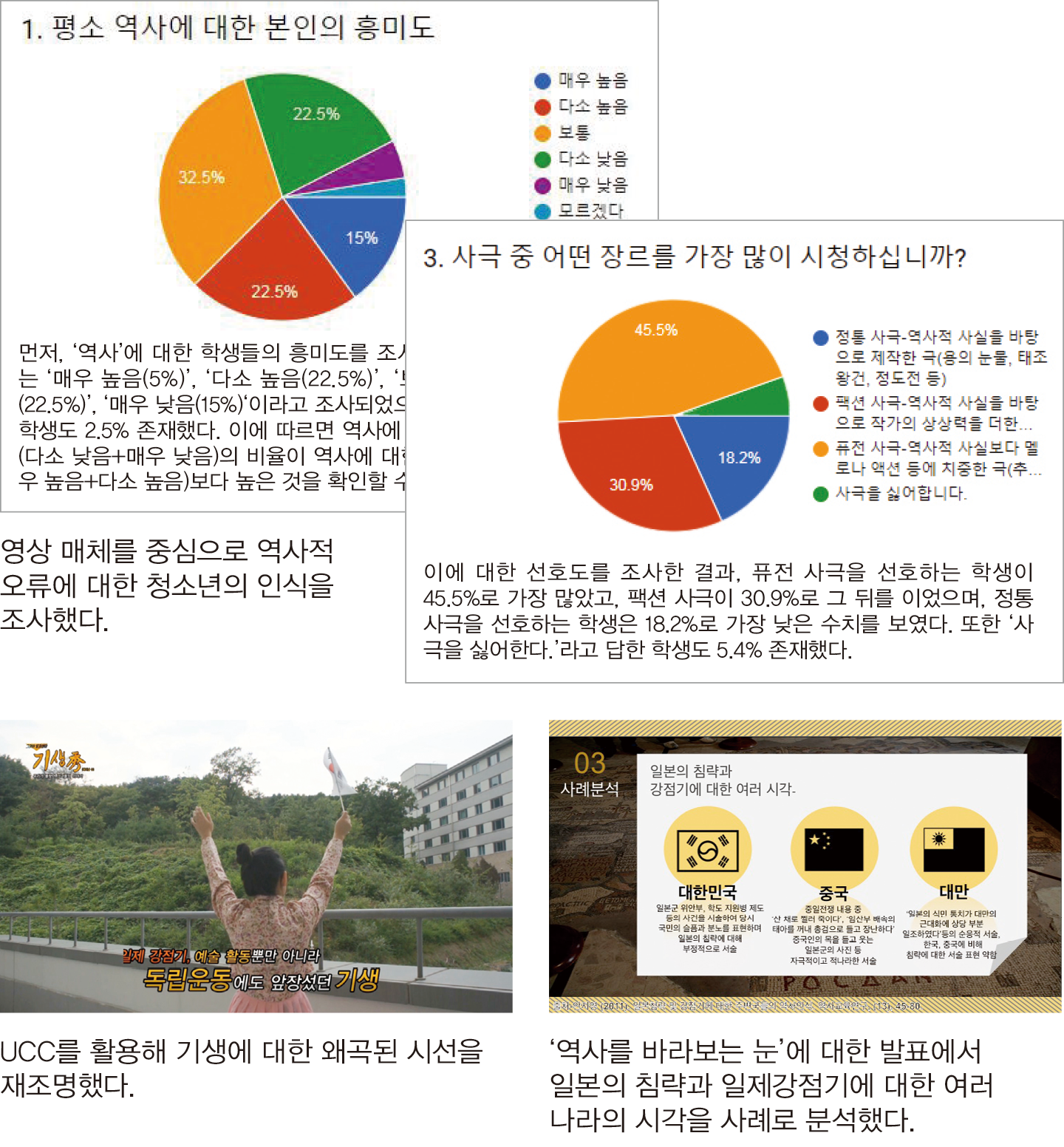 그래서 <그것이 알고 싶다>의 형식을 빌려 잘못된 기생에 대한 이미지를 바로잡는 UCC를 제작했고, 친구들이 신기해했다. ‘<군함도>에 수용된 조선인의 모습은 사실일까?’ ‘선덕여왕은 어떤 인물일까?’ ‘영화 <밀정>의 모티브가 된 항옥은 어떤 인물일까?’ 등 미디어 속 역사적 사실에 관해서도 관심을 가졌다.