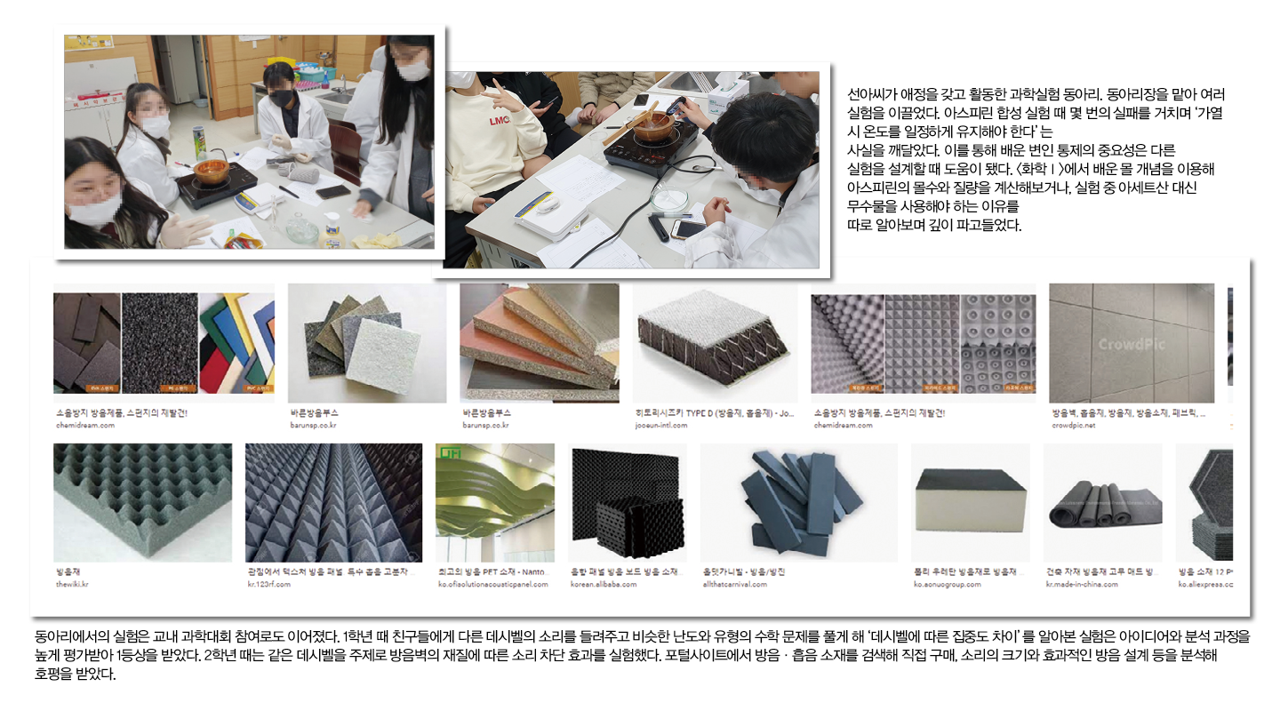 과학 수업과 과학실험 동아리에서 다양한 실험 경험도 쌓았다. 특히 실험 과정에서 겪은 수많은 실패는 선아씨가 공학 분야의 적성을 확인하는 계기가 됐다.